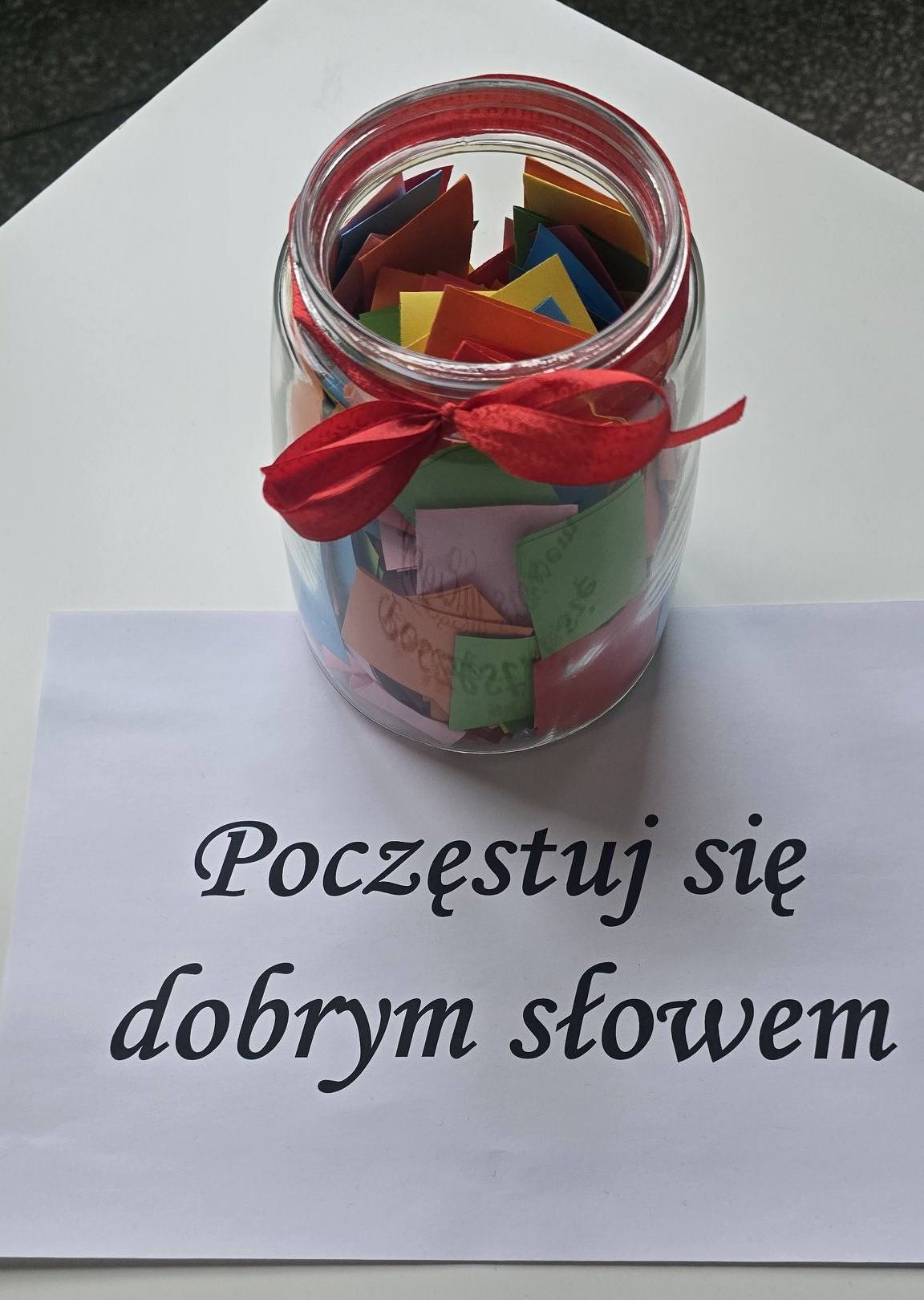 Dużym zainteresowaniem cieszył się również „Słoik dobrych słów” z pozytywną wiadomością, komplementem, z miłym przekazem. Uczniowie losowali karteczki przez cały dzień, dzieląc się życzliwymi myślami i budując przyjazną atmosferę.