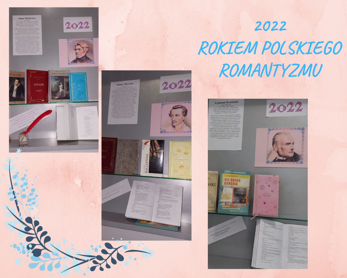 Nasza szkolna biblioteka na jesieni przedstawiła sylwetkę Marii Konopnickiej. W ostatnich dniach w gablotach przed wypożyczalnią pojawiła się wystawa nt. polskiego romantyzmu i ich głównych przedstawicieli. W czasie akcji „4 minuty dla literatury” czytano „Romantyczność” Adama Mickiewicza.