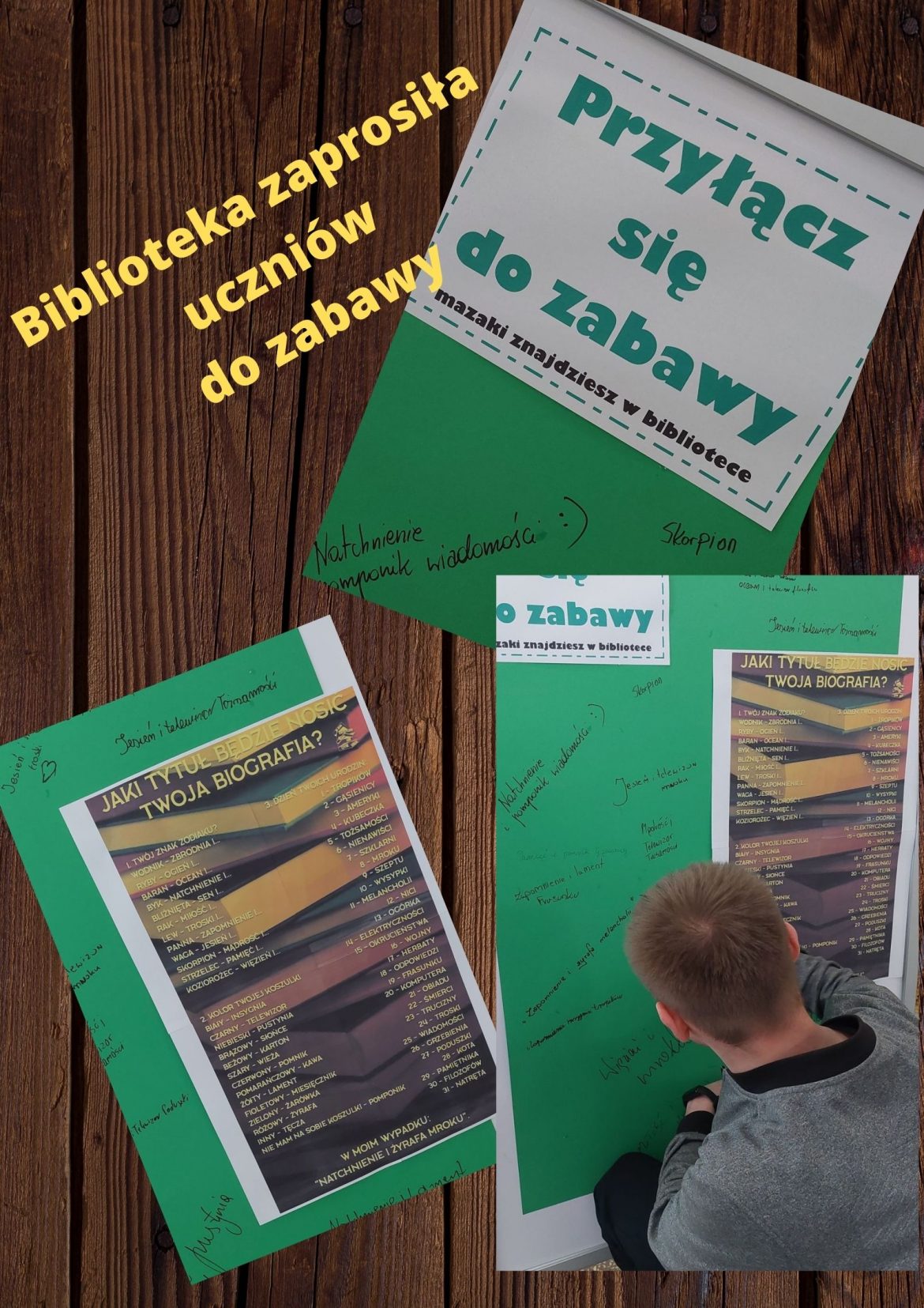 Kolejny raz biblioteka ZSZ zaprosiła uczniów do zabawy. Jaki tytuł będzie nosić twoja biografia??? Chętni uczniowie szukali odpowiedzi na to pytanie łącząc swój znak zodiaku, kolor koszulki i dzień urodzin. Co z tego wniknęło? Oto parę tytułów: „jesień i telewizor tożsamości”, „Jesień i insygnia troski”, „Więzień i pustynia mroku”, „Zapomnienie i żyrafa melancholii”, „Pamięć i pomnik gąsienicy”, „Zapomnienie i Insygnia tropików”, „Natchnienie i pomponik wiadomości” i inne. Kto odważyłby się przeczytać takie biografie???