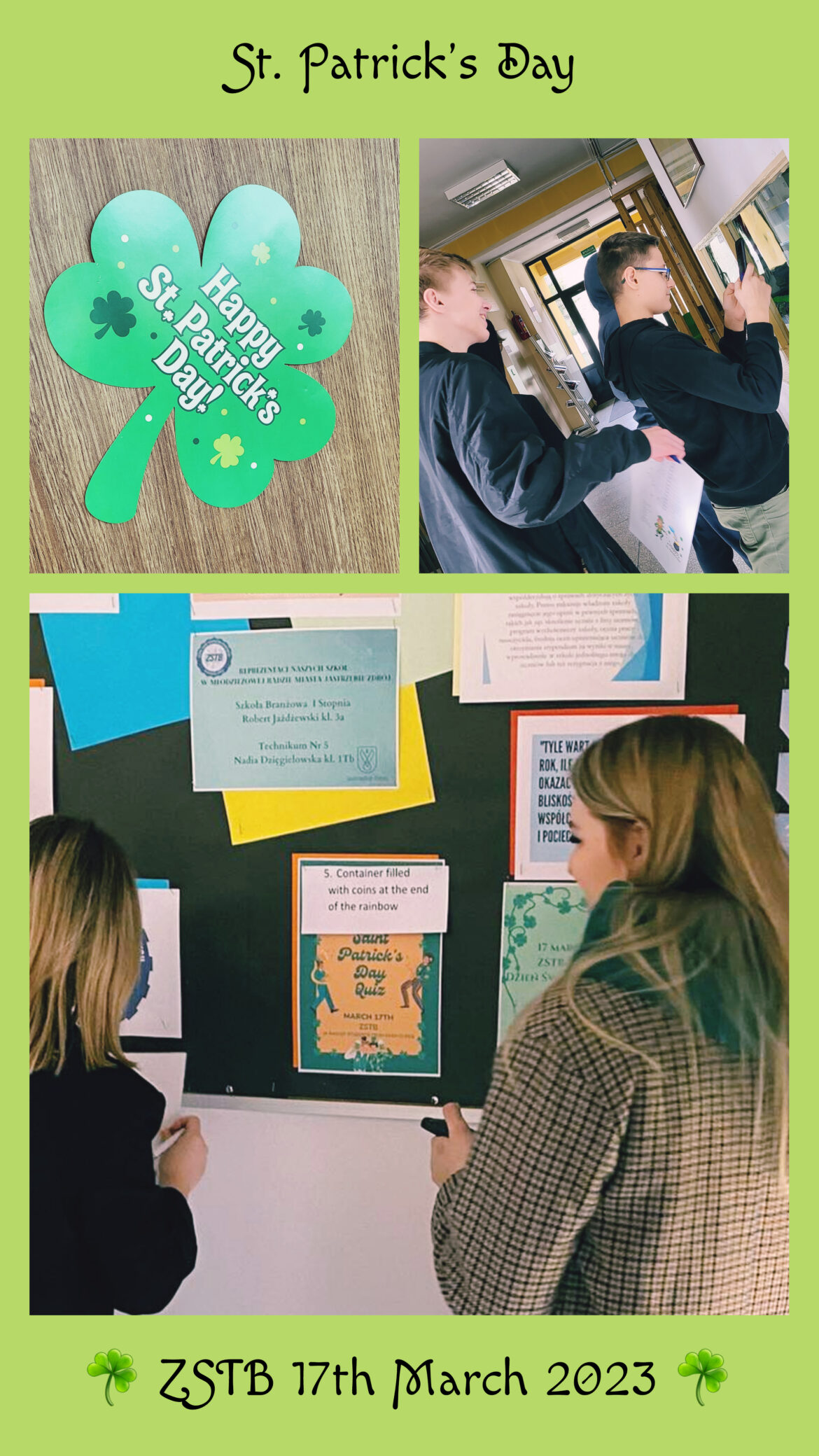 7 marca w piątek w naszej ZSTB świętowaliśmy Dzień Świętego Patryka. Tego dnia na lekcjach języka angielskiego mogli zapoznać się z postacią patrona Irlandii, natomiast przedstawiciele klas obecnych tego dnia w szkole, wzięli udział w zabawie, w której sprawdzana była wiedza o Irlandii, św. Patryku oraz tradycjach i obyczajach związanych z obchodami dnia Jego imienia. Zadanie nie było łatwe, gdyż uczniowie musieli się wykazać nie tylko wiedzą na powyższe tematy, ale również dobrą znajomością języka angielskiego oraz orientacją w terenie gdyż pytania rozsiane były na terenie całej szkoły. Najszybciej i najlepiej z pytaniami poradzili sobie uczniowie klasy 1c, ale reszta poradziła sobie równie dobrze.