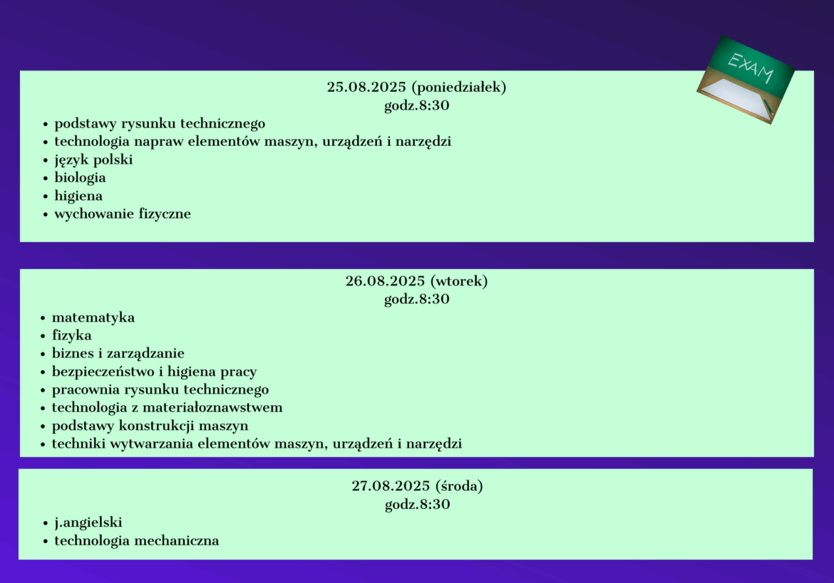 Aktualności Harmonogram egzaminów poprawkowych – korekta Przez A Gr 30 czerwca 2025 30 czerwca 2025 1,K Wyświetlenia 1,K 0 FacebookTwitterThreadsBlueskyEmail Przeczytaj również Ogólnopolska Olimpiada Wiedzy o Transporcie Kolejowym 3 listopada 2025 Ogólnopolska Olimpiada Wiedzy i Umiejętności Fryzjerskich 30 października 2025 OGÓLNOPOLSKA OLIMPIADA ZDROWIA 30 października 2025 Ślubowanie na Ucznia Rzemiosła 29 października 2025 SPARTAKIADA BRANŻOWA 29 października 2025