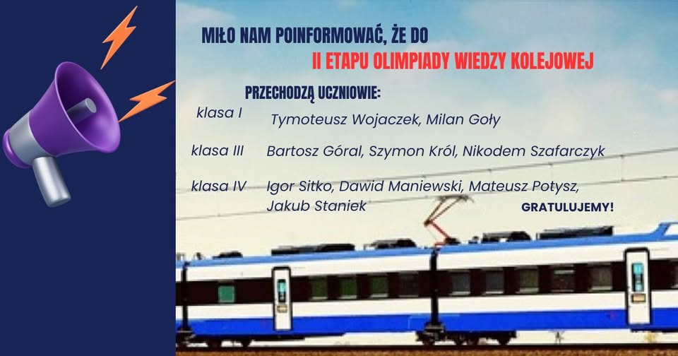 Aktualności Kolejarze w kolejnym etapie Olimpiady „Kolej Bez Granic” Przez w W 10 kwietnia 2026 10 kwietnia 2026 10 Wyświetlenia 10 0 FacebookTwitterEmail Przeczytaj również Dzień Otwarty Szkoły 10 kwietnia 2026 Festiwal Sztuki Fryzjerskiej 1 kwietnia 2026 „Zagubieni w sieci” – rekolekcje, które dają do... 30 marca 2026 Krajowy Plan Odbudowy NextGenerationEU 25 marca 2026 Erasmus+ 19 marca 2026
