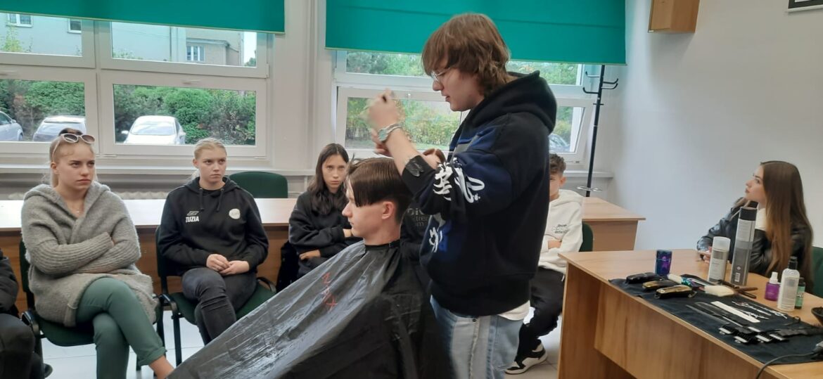 Uczniowie klas fryzjerskich w dn.16.10.2023 wzięli udział w krótkim pokazie cieniowania włosów nożyczkami i narzędziami brzytwopodobnymi -„fade”