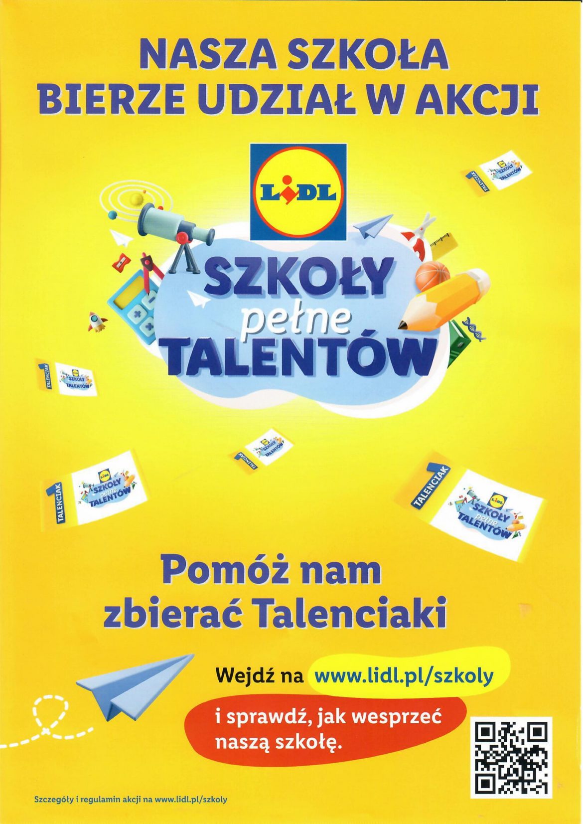 Nasza szkoła bierze udział w akcji Lidla – Szkoły Pełne talentów, której celem jest wsparcie talentów i zmobilizowanie lokalnej społeczności do wsparcia działań szkoły. Wystarczy zrobić zakupy w Lidlu, odebrać TALENCIAKI za każde wydane na zakupy 50 zł (w zakupach musi znaleźć się owoc lub warzywo) i w formie papierowej przekazać szkole lub zeskanować kod i przekazać punkty na konto szkoły. Akcja trwa od 5 września do 18 listopada. Pudełka, do których można wrzucać zdobyte Talenciaki znajdują się przy wejściu do szkoły i w bibliotece.