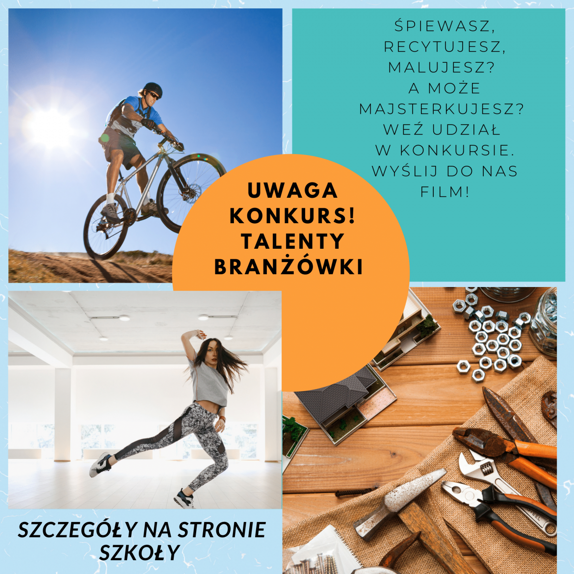 Jeżeli śpiewasz, recytujesz, grasz na instrumencie, szyjesz, projektujesz, malujesz, majsterkujesz, uprawiasz jakąś dyscyplinę sportową zapraszamy wspólnie z samorządem uczniowskim do udziału w konkursie.