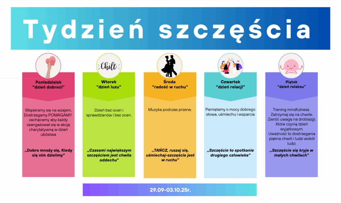 Aktualności Tydzień szczęścia Przez w W 26 września 2025 26 września 2025 151 Wyświetlenia 151 0 FacebookTwitterThreadsBlueskyEmail Przeczytaj również Ogólnopolska Olimpiada Zdrowia. 20 listopada 2025 Ogólnopolska Olimpiada Wiedzy i Umiejętności Fryzjerskich 20 listopada 2025 ⛏️ To była podziemna przygoda klas 3a i... 19 listopada 2025 ✨Szkolenie z fryzur ślubnych ✨ 19 listopada 2025 IV edycja konkursu fryzjerskiego o Tytuł „Mistrza Upięcia”... 19 listopada 2025