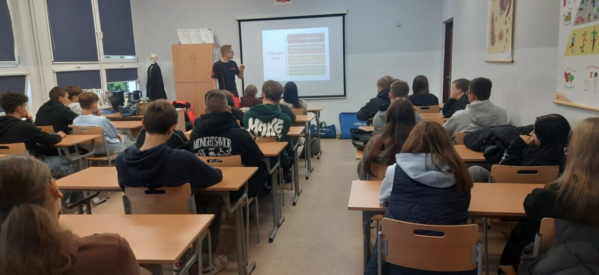 Uczniowie ZSTB wzięli udział w warsztatach pierwszej pomocy przedmedycznej. W spotkaniu brały udział klasy 1e, 2d,1 TA. Młodzież miała możliwość zapoznania się z podstawowymi zasadami udzielania pomocy w stanach nagłych jak omdlenia, urazy głowy, kończyn, oparzenia, zranienia, zakładania opatrunków, zasad bandażowania. Dziękujemy za duże zaangażowanie .Każdy z nas wykonał cenne zadania praktyczne – pozycja bezpieczna.